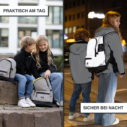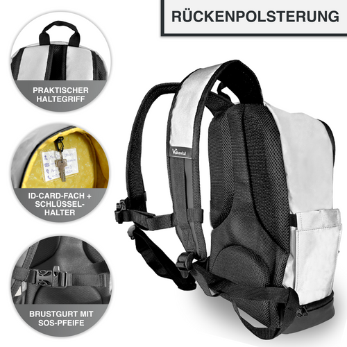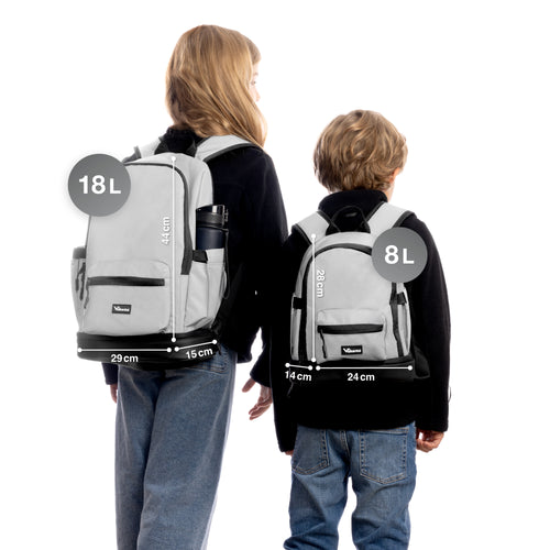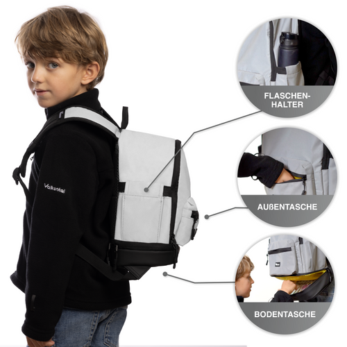 Pour une bonne structure de ton bagage, nous avons ajouté quelques compartiments pratiques. Il s'agit d'un compartiment pour ordinateur portable jusqu'à 15 pouces (uniquement la variante 23L, sauf le noir avec fonction de refroidissement), d'une poche en filet à l'intérieur pour les petits objets, de la poche frontale pour les petits objets et de la poche en filet latérale pour les boissons.