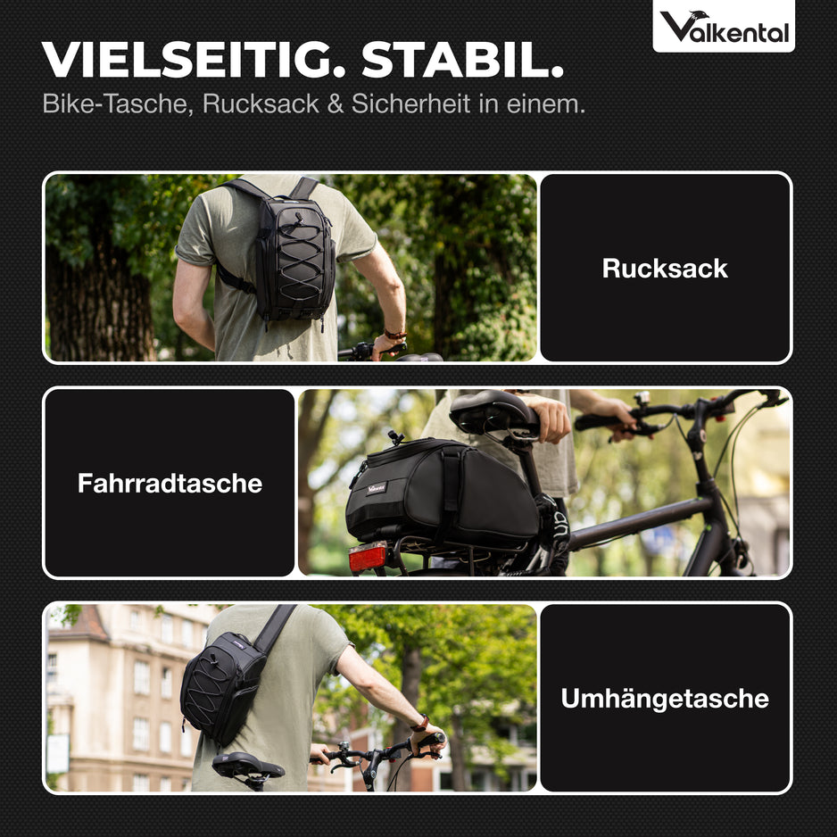 Le ValkOne est une solution polyvalente qui combine un sac à dos complet, une sacoche de porte-bagages et une sacoche à bandoulière. Plus besoin de se contenter de porter son sac de porte-bagages d'une seule main ou de porter un sac à dos sur le dos pendant le vélo. Comme le disent si bien les propriétaires de Valkental : « La vie est tout simplement plus agréable quand on a les mains libres ».
