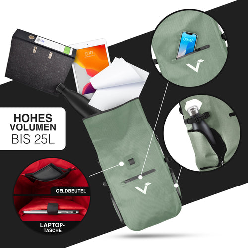 Grâce à la fermeture à enroulement pratique, ton sac 3en1 est aussi grand que tu en as besoin. Tu peux le rouler fortement pour obtenir un volume de 18L et le rouler peu pour obtenir un volume de 25L.